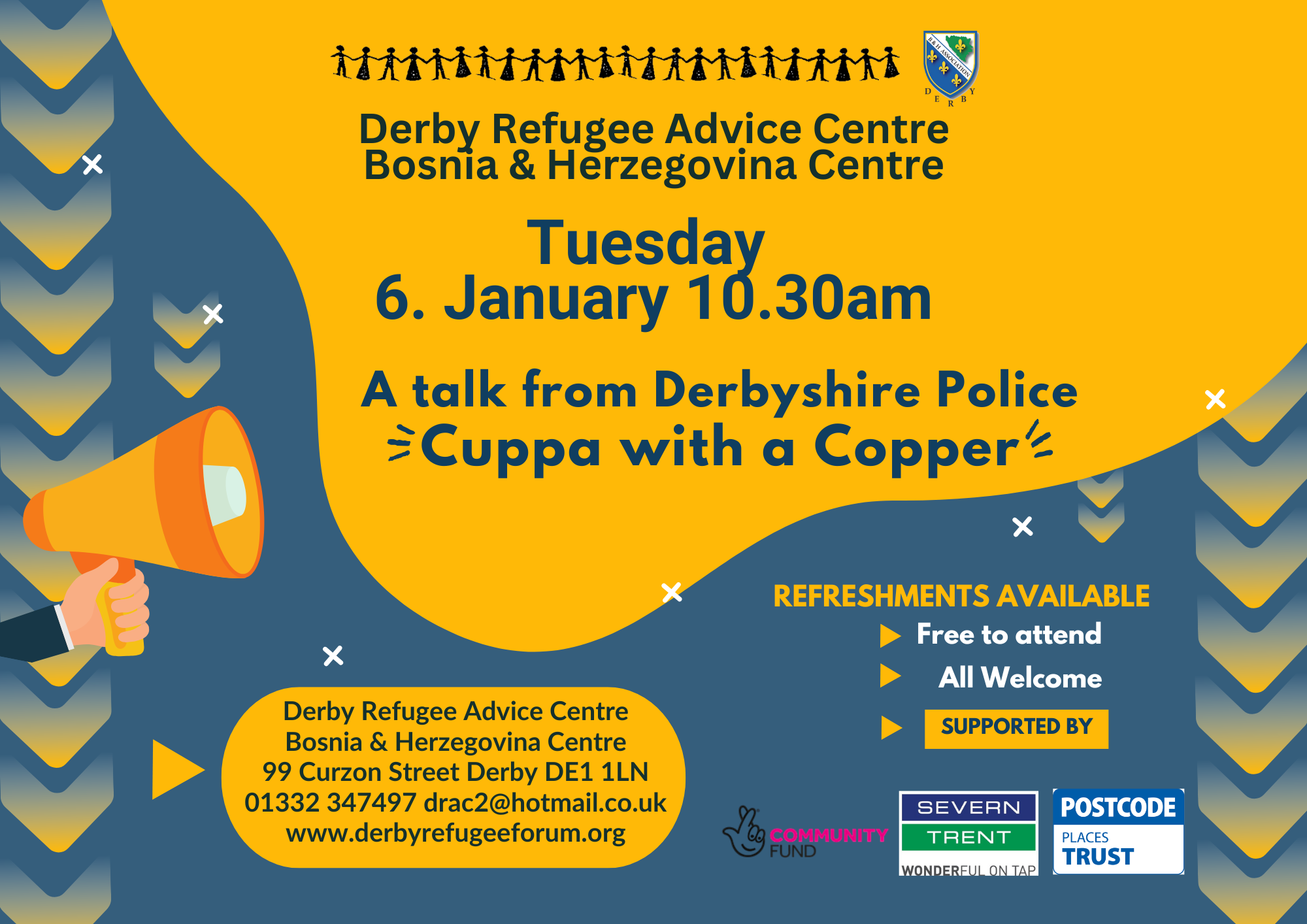 Join us at the Bosnian Centre and Derby Refugee Advice Centre on Tuesday 6. January at 10:30am for a friendly talk from our local police.
