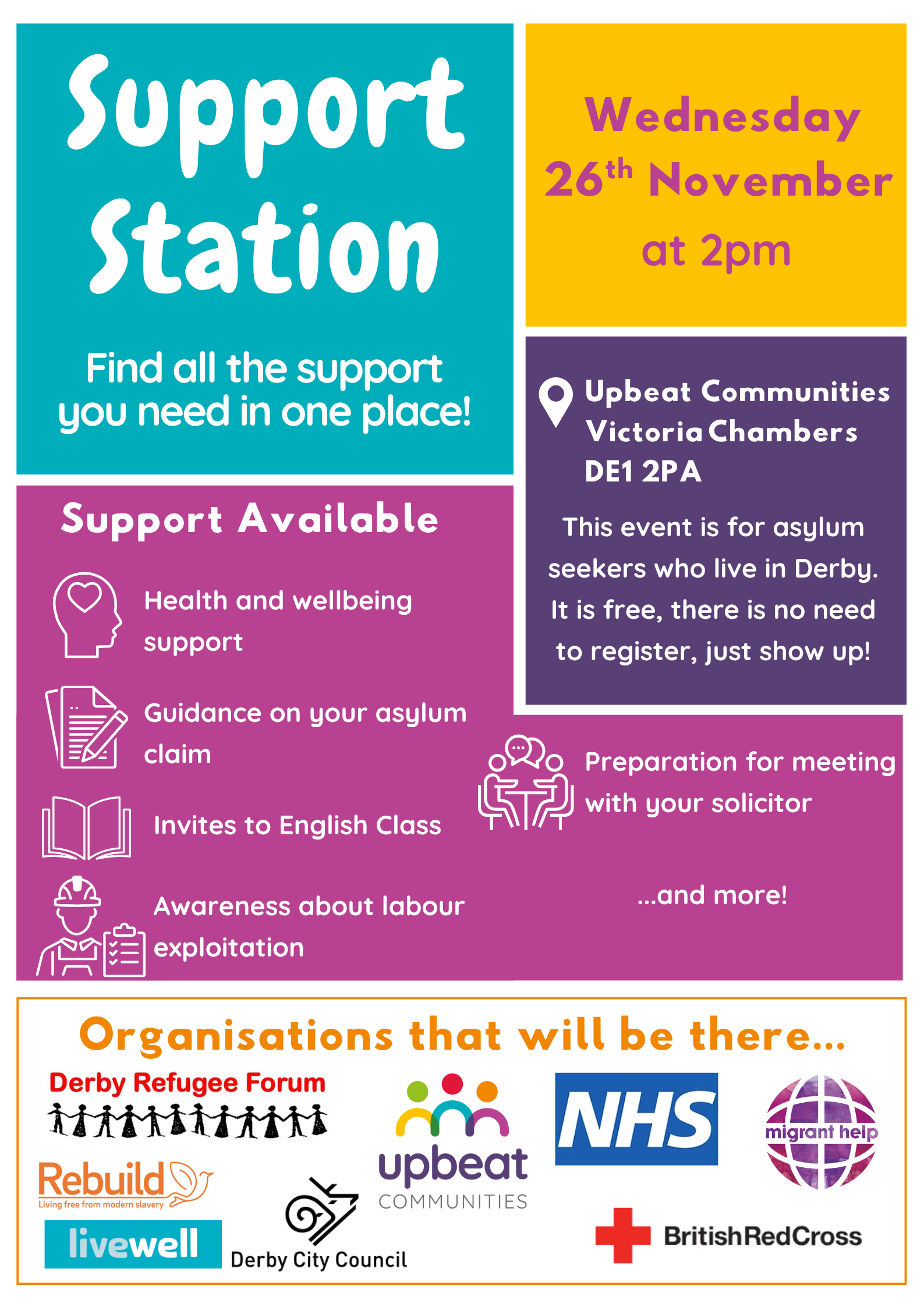 Asylum seekers in Derby can access free support on Wednesday 26th November at 2pm at Upbeat Communities.